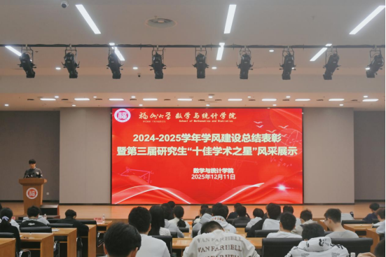 12月11日晚,数统学院在晋江楼一楼报告厅举办2024-2025学年学风建设总结表彰暨第三届研究生学术之星风采展示大会,旨在表彰在学术研究、学科竞赛、道德风尚等领域表现卓越的个人与集体,激励全院师生砥砺奋进、追求卓越,持续营造浓厚且积极的学术氛围。数统学院党委书记郑世珠、院长刘勇进教授、党委副书记蓝荣聪、副院长程航教授等教师代表以及学生代表参加,大会由院长助理严锴副教授主持。