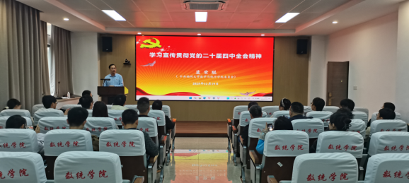 12月19日下午,数统学院党委在院208报告厅举办党的二十届四中全会精神宣讲报告会。学院党委书记郑世珠主持会议,党委副书记蓝荣聪教授领学全会精神,学院党委委员、各师生党支部书记及支部委员参会学习。