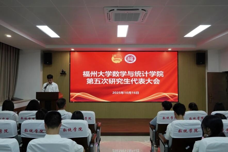 2025年10月16日,数学与统计学院第五次研究生代表大会在数统楼208报告厅举行。学院团委副书记沈成平、福州大学及法学院研究生会主席团成员、学院研究生会主席团成员及研究生代表参会。